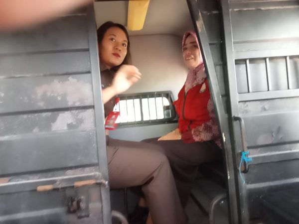 Kades Siweli saat ditahan menggunakan jilbab merah mudah, dan rok panjang berwarna coklat tua.