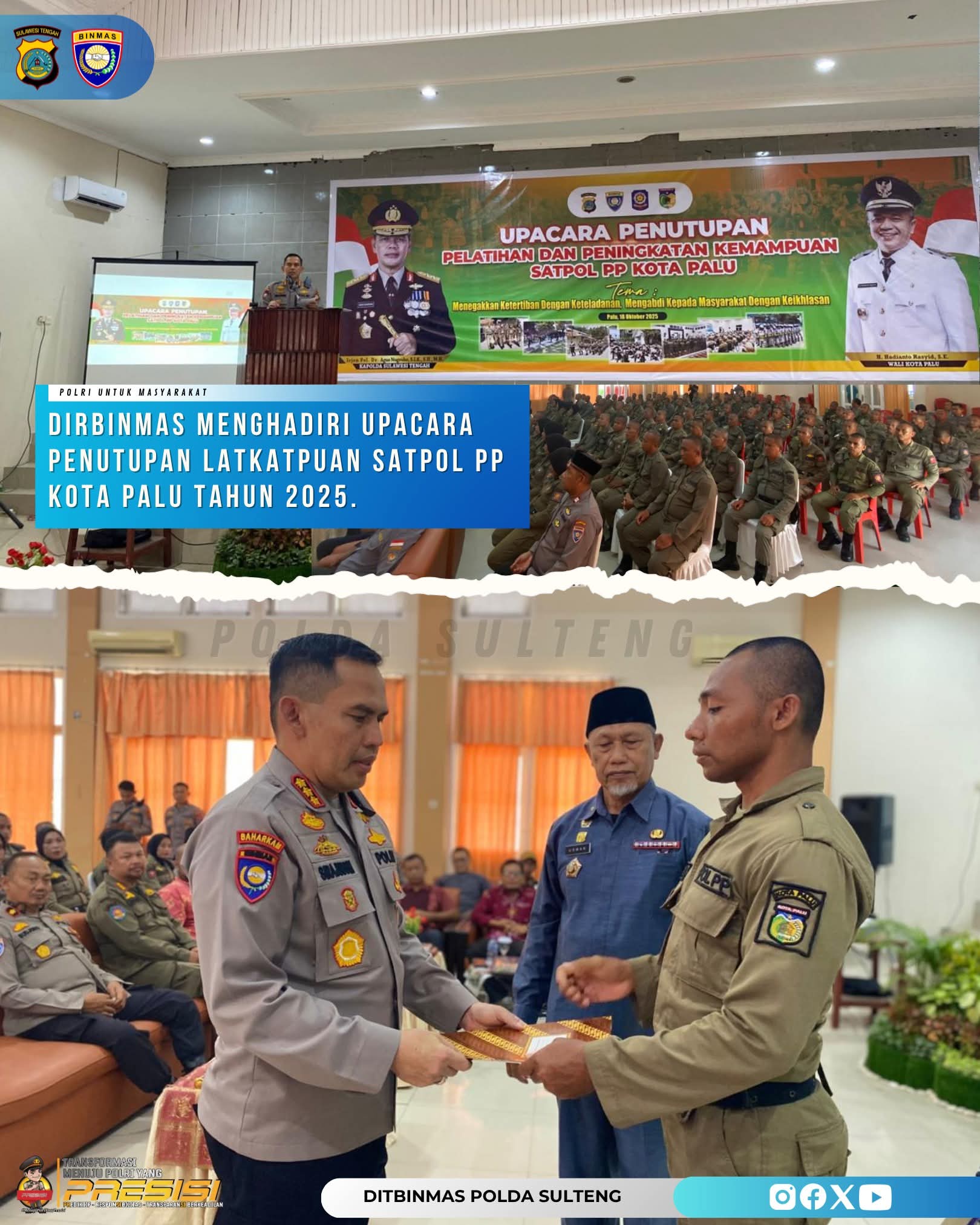 Sebelumnya pada 17/10/2025 Dirbinmas Polda Sulteng Kombes Pol Dr. Sirajuddin Ramly., S.H., M.H. memberikan arahan kepada peserta Pelatihan dan Peningkatan Kemampuan Satpol PP Kota Palu dan pada (18/10/2025) Kombes Pol. Dr. Sirajuddin Ramly, S.H., M.H.juga menghadiri Upacara Penutupan Pelatihan Dan Peningkatan Kemampuan (LATKATPUAN) Satuan Polisi Pamong Praja Kota Palu bertempat di Gedung Asrama Haji Transit Palu Jl. WR. Supratman.