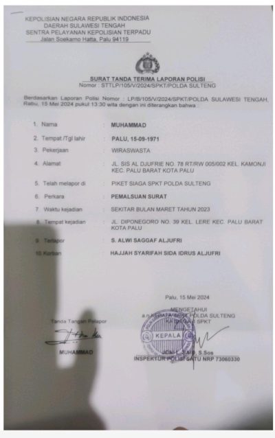 “Kami dari Tim kuasa hukum ibu Syarifah Sida Aljufri, anak Guru Tua atas pernikahannya dengan Itje Ami, Putri Bangsawan Kaili, telah melaporkan Sayid Alwi terkait dugaan pemalsuan surat dan keterangan palsu yang merugikan klien kami, karena yang kita ketahui Bersama perubahan akta yayasan Alkhairaat diduga didasari adanya pemalsuan surat dan keterangan palsu yang dilakukan oleh terlapor sehingga bisa terjadi perubahan akta nomor 08 dikeluarkan oleh notaris Irwan,” ungkap Direktur LBH Sulteng Julianer Jum’at (24/05).